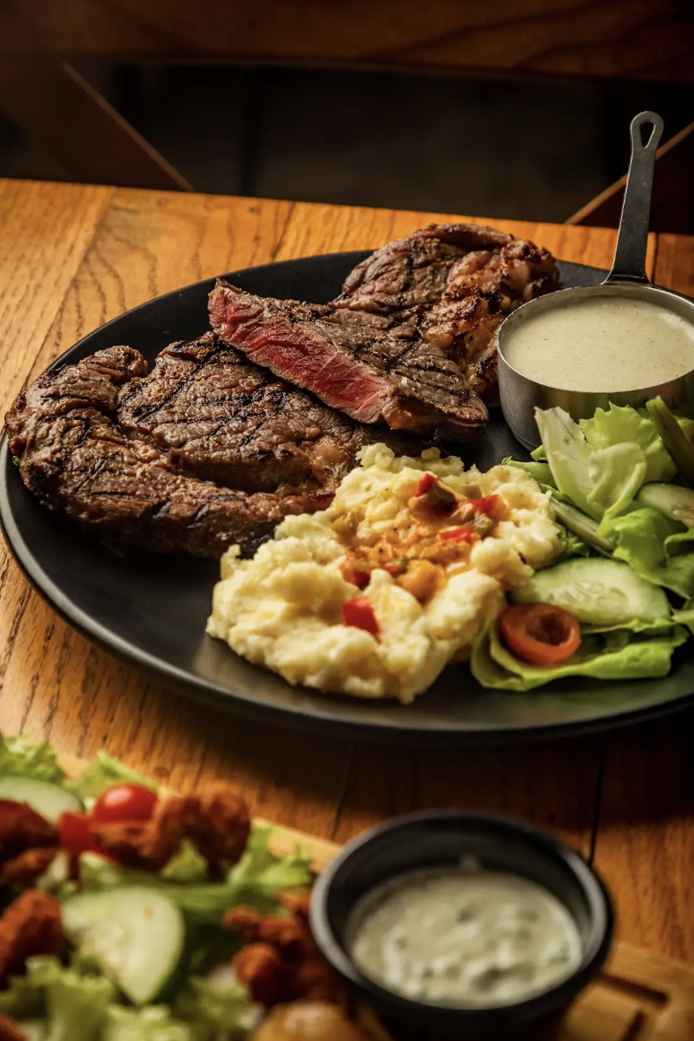 400 gramos de corte New York marinado, acompañado de una cama de arúgula salsa de hongos, puré de papa rústico, relish de morrón de tomate cherry y ensalada.