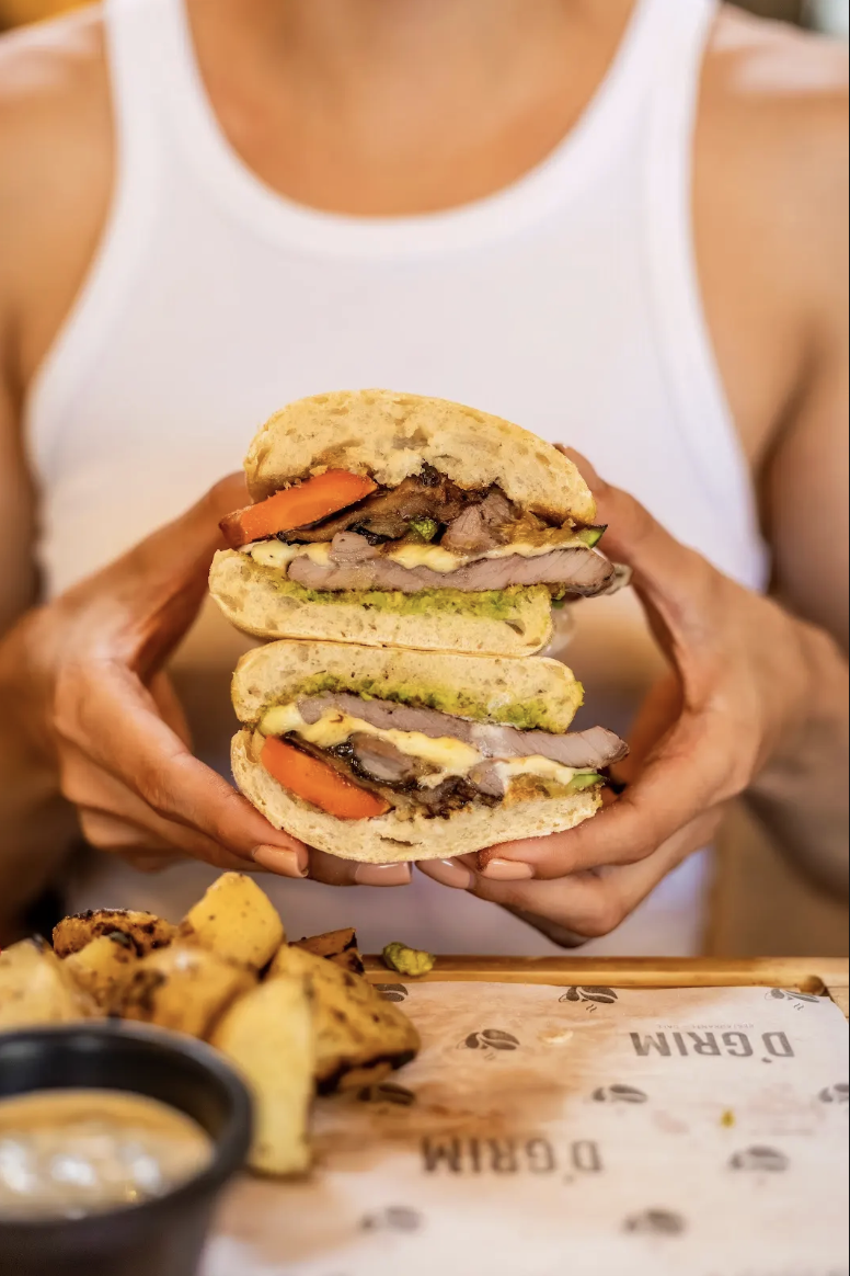 Pan ciabatta, base de guacamole al ajo, 150 gr de pechuga de pollo al grill, panela asada, vinagreta de balsámico, acompañado de papas cambray y ensalada.